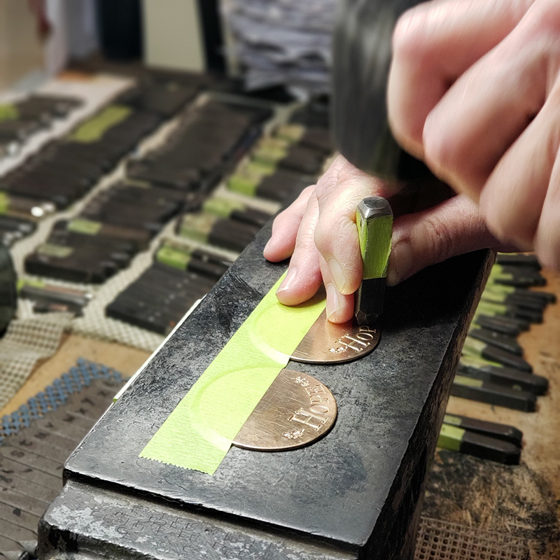 Melissa stamps words, phrases, dates, coordinates, and graphics on repurposed and new...