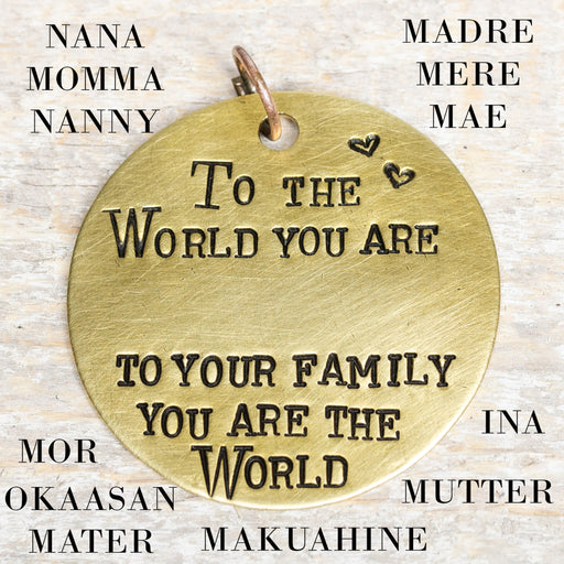 Melissa hand-stamps brass discs for you to enjoy as a key ring OR necklace. This title is "To the world you are ... To your family you are the worl...