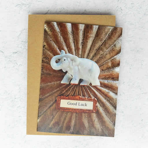 This is a detail image of an original piece of art created by Jenny K of the Junkgirls. The white elephant is holding its trunk upward. Cards are b...