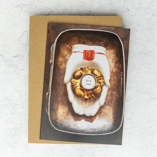 Detailed Image of Jenny's original art piece entitled, "I Love You" graces the front of this 4.25” wide x 6” high greeting card with kraft envelope...