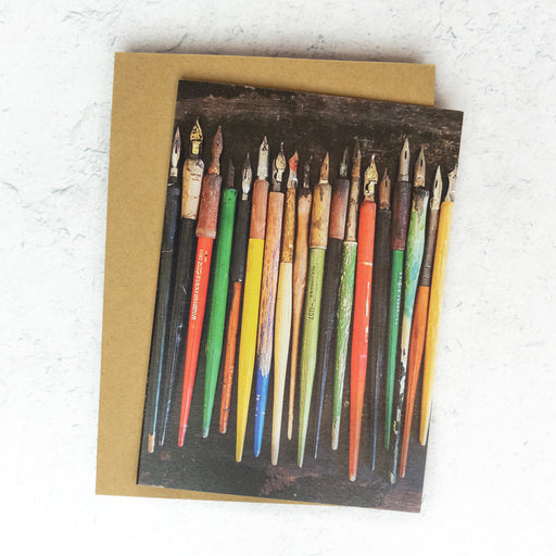 This is a detailed image of artist paint brushes. Cards are blank inside for your personal message and come with kraft A6 envelope in a clear slee...