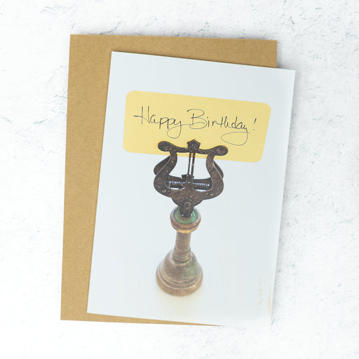 Detailed Image of one of Jenny's signature "Toot" pieces holding a note entitled, "Happy Birthday" graces the front of this 4.25” wide x 6” high gr...