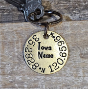 Melissa hand-stamps brass discs with your requested location for you to enjoy as a key ring OR necklace.  The 16 gauge disc is 1.5" in diameter.