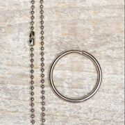 This product comes packaged with split key ring & 30" nickel plated steel ball chain, enclosed in a clear plastic sleeve.