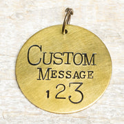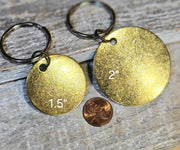 We hand-stamp brass discs with your personalized word(s), phrase or date to enjoy as a key ring OR necklace. The 16 gauge disc is available in 1.5" or 2" in diameter.