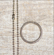 This product comes packaged with split key ring & 30" nickel plated steel ball chain, enclosed in a clear plastic sleeve.