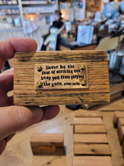 We create these special blocks using some of my favorite quotes, stamped by Melissa on brass and then attach them to wooden blocks we cut out of old oak Railroad car flooring. Each one is slightly different - making them special and unique! Please allow us to choose for you.