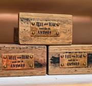 We create these special blocks using some of my favorite quotes, stamped by Melissa on brass and then attach them to wooden blocks we cut out of old oak Railroad car flooring. Each one is slightly different - making them special and unique! Please allow us to choose for you.