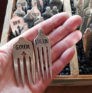 We stamp cheese names on silverplate fork tines. We have a large list, but we welcome custom orders! Look for the 'custom' listing and fill in the blank. We'll do the rest!