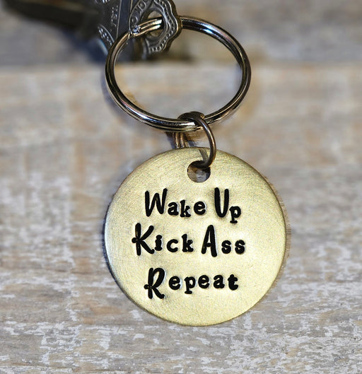Melissa hand-stamps brass discs for you to enjoy as a key ring OR necklace! This title is "Wake up. Kick ass. Repeat." The 16 gauge disc is 1.5" i...