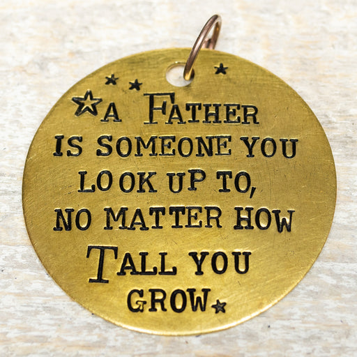 Melissa hand-stamps brass discs for you to enjoy as a key ring OR necklace! This quote is "A Father is someone you look up to, no matter how tall y...