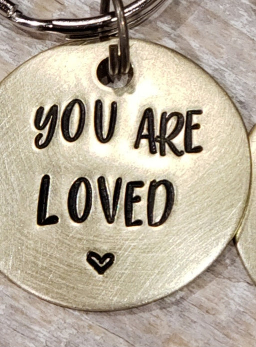 Melissa hand-stamps brass discs for you to enjoy as a key ring OR necklace! This title is "You are Loved". The 16 gauge disc is 1.5" diameter. Eac...