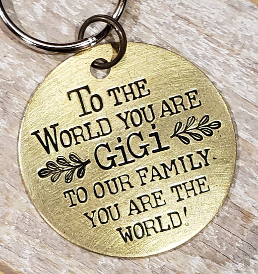 Melissa hand-stamps brass discs for you to enjoy as a key ring OR necklace! This title is "To the world you are Gigi, To your family you are the wo...