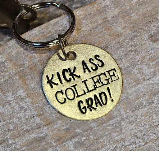 Melissa hand stamps the quote "Kick Ass College Grad" on a 1.5" diameter disc made of repurposed brass then adds the jump ring with a key ring. Als...