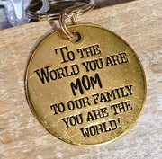 Melissa hand-stamps brass discs for you to enjoy as a key ring OR necklace! This title is "To the world you are Mom, to your family you are the World!" The 16 gauge disc is 2" in diameter. Penny is shown for size.