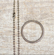 This product comes packaged with split key ring & 30" nickel plated steel ball chain, enclosed in a clear plastic sleeve.