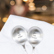 Melissa stamps a set of 2 soup or tablespoons with: "My Ice Cream" & "Your Ice Cream". This is a perfect gift for wedding, anniversary, couples, friends, teachers, teammates, neighbor, or anyone who loves ice cream.
