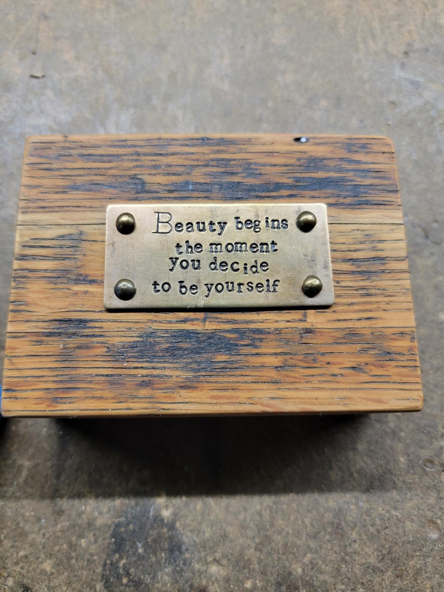We create these special blocks using some of my favorite quotes, stamped by Melissa on brass and then attach them to wooden blocks we cut out of old oak Railroad car flooring. Each one is slightly different - making them special and unique! Please allow us to choose for you.