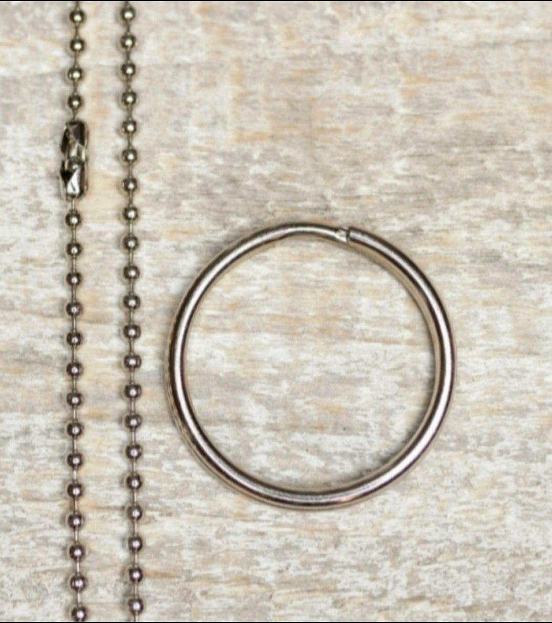 This product comes packaged with split key ring & 30" nickel plated steel ball chain, enclosed in a clear plastic sleeve.