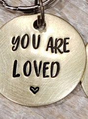 Melissa hand-stamps brass discs for you to enjoy as a key ring OR necklace! This title is "You are Loved". The 16 gauge disc is 1.5" diameter.
