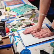 elements, stencils, found objects (aka junk), and layering to achieve interesting textures and designs on various types of paper, including vintage dictionary pages, maps, book pages, etc. The pieces you create can be used in collage, journaling, card making or matted and framed as a piece of art. We will be using Gelli, a well-known brand that creates (non-animal derived) gelatin-based plates and acrylic paint.