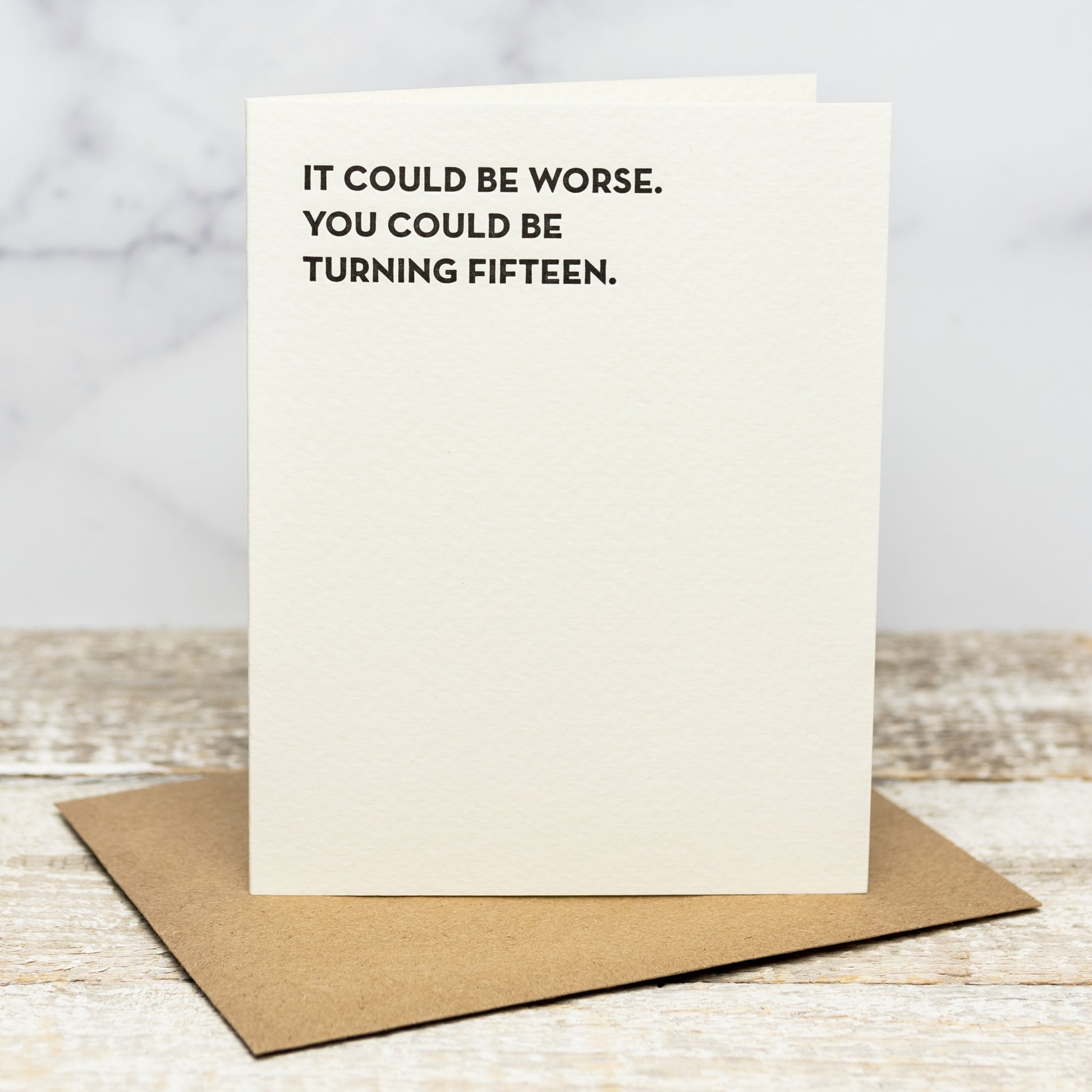 Sapling Press makes some great, funny greeting cards that we think you'll enjoy! This one reads "It could be worse. You could be turning fifteen."