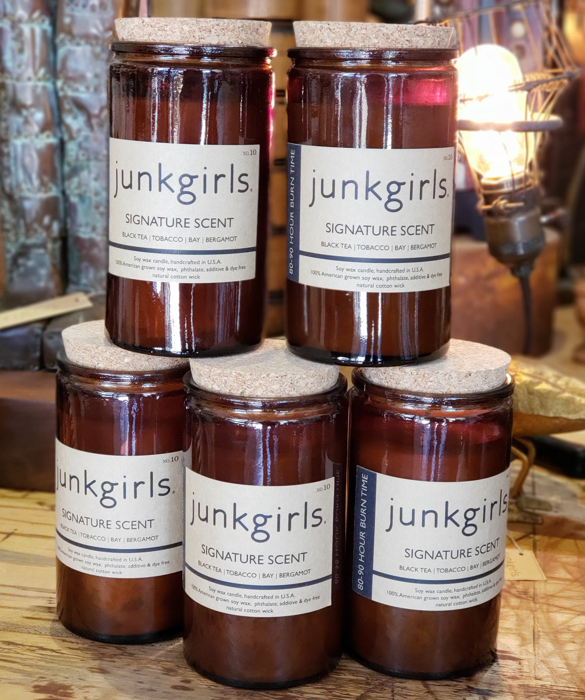 It's back! The junkgirls signature scent soy candle in a generous 16 oz glass tower with cotton wick and cork top.