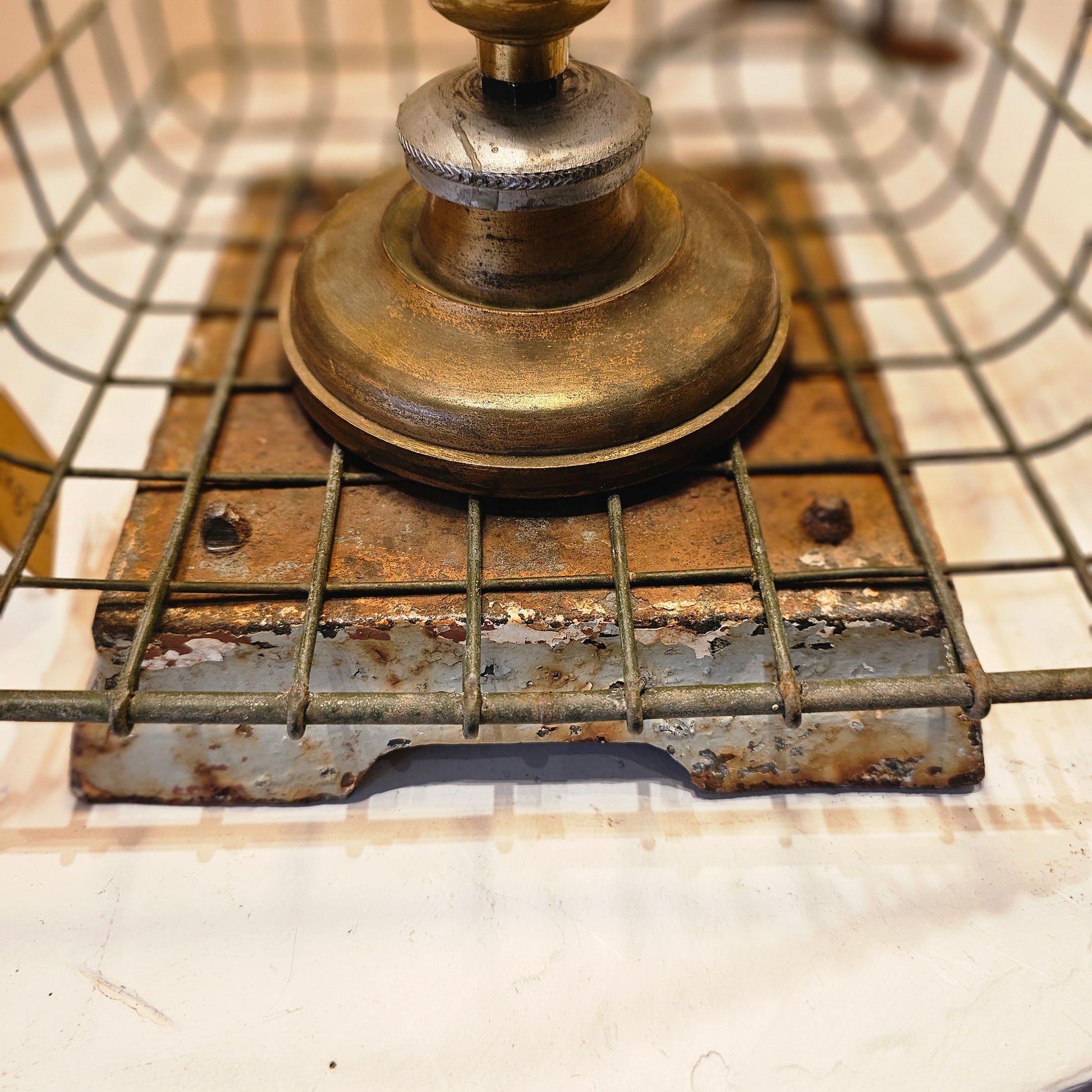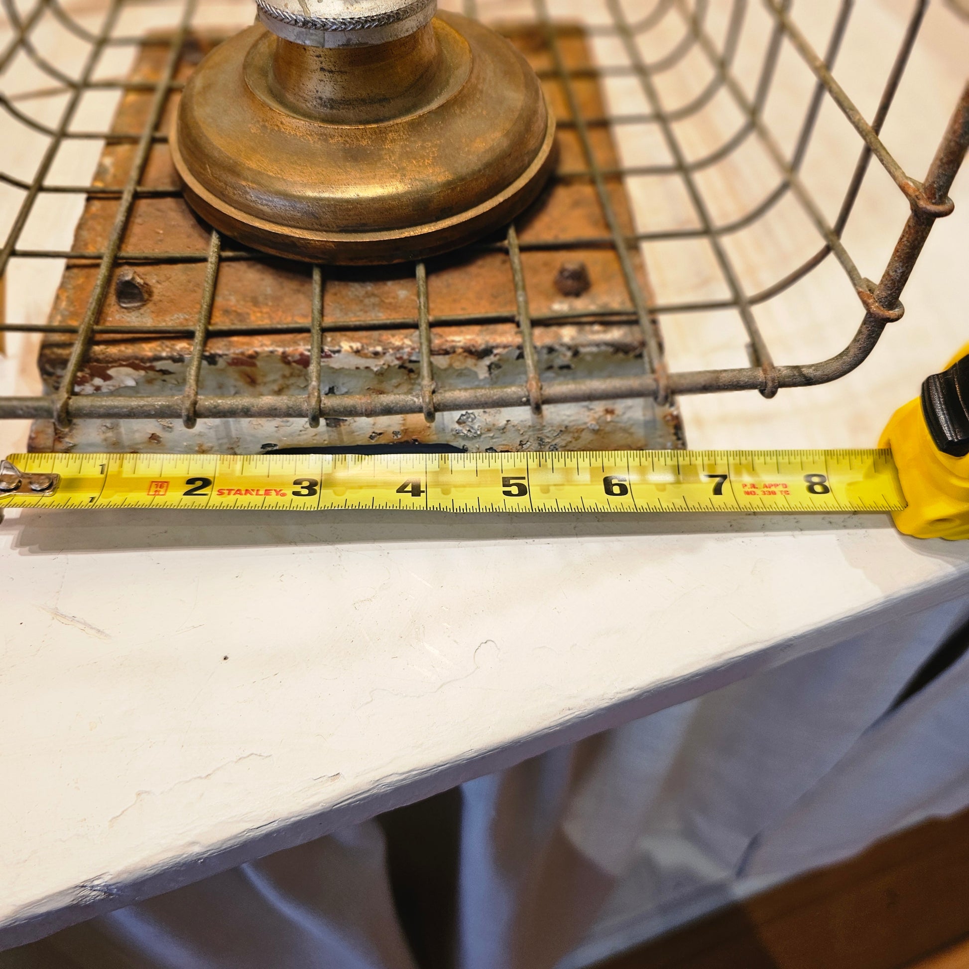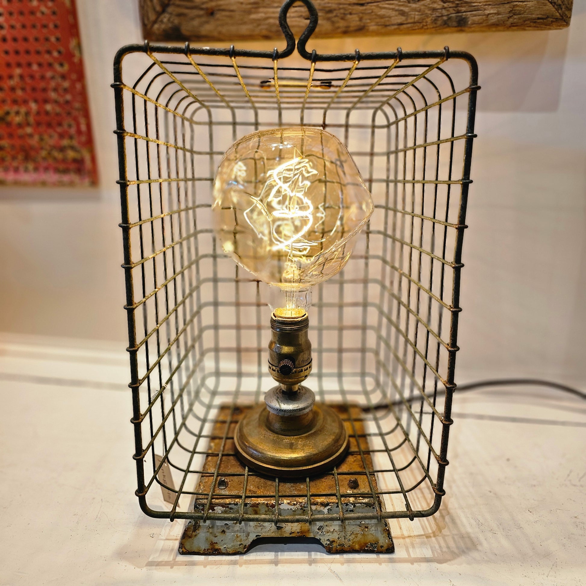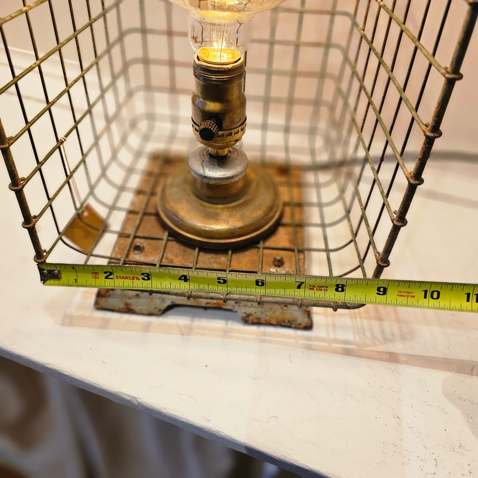 This Jenny K lamp is named 'Kasper' and has a vintage, locker basket (#117) as a surround and the whole thing sits on a cast metal base which is 6.5" square. Overall height is 15". Socket is vintage with all new liner and new restoration grade cloth covered wire. Bulb is new, LED 4watt with an approximate diameter of 5".