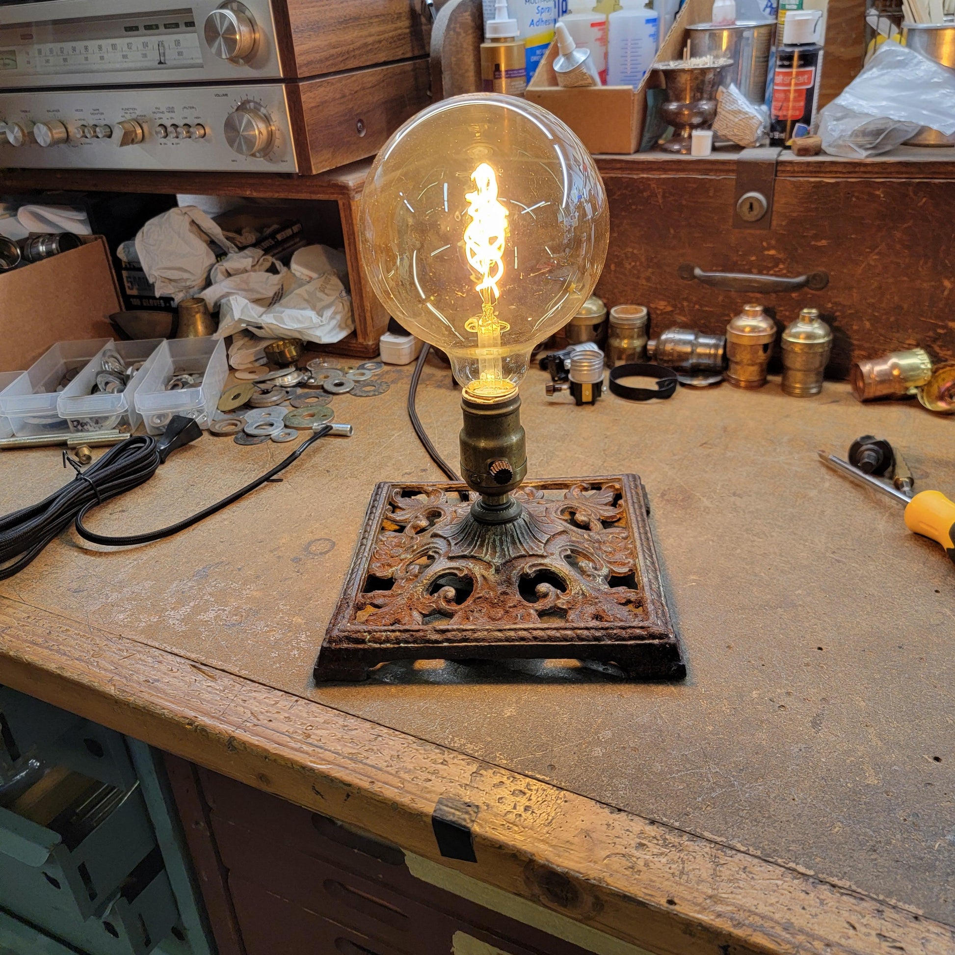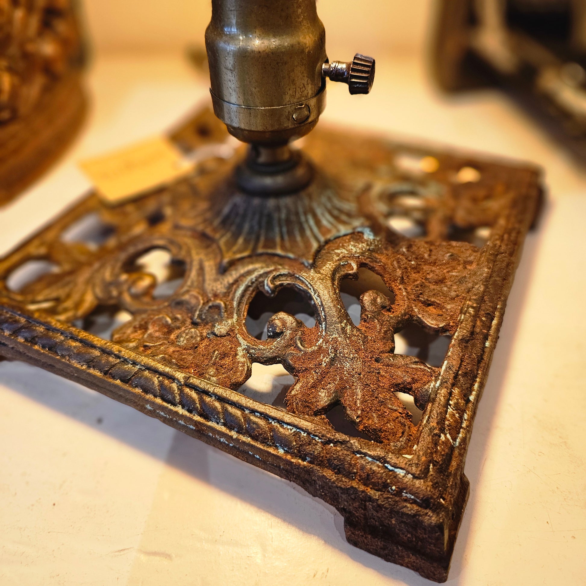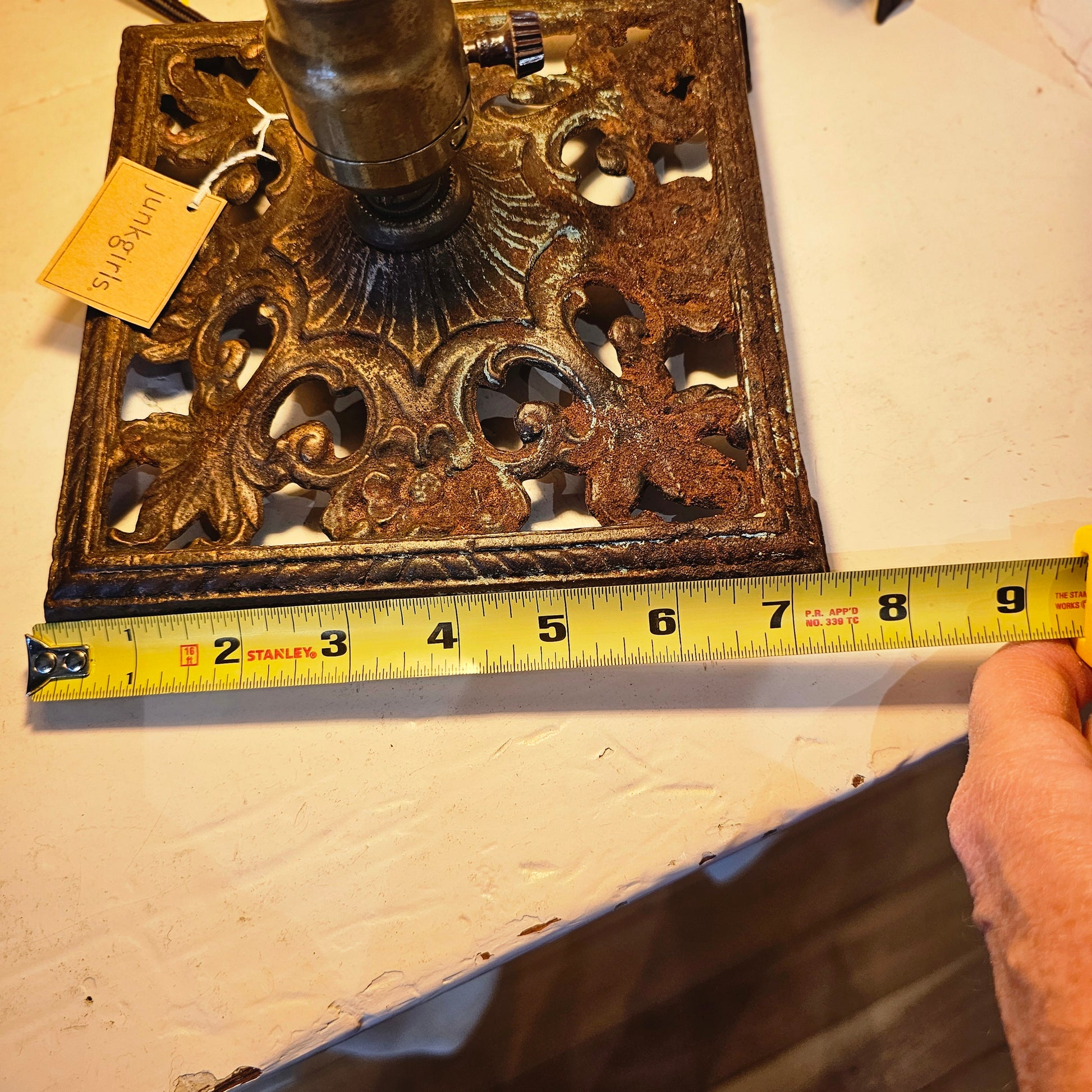 This Jenny K lamp is named 'Meryl' and has a vintage, decorative cast metal base of leaves and flowers which is 7.5" square. Height with bulb is 11". Socket is vintage with all new liner and new restoration grade cloth covered wire. Bulb is new, LED 4watt with an approximate diameter of 5".