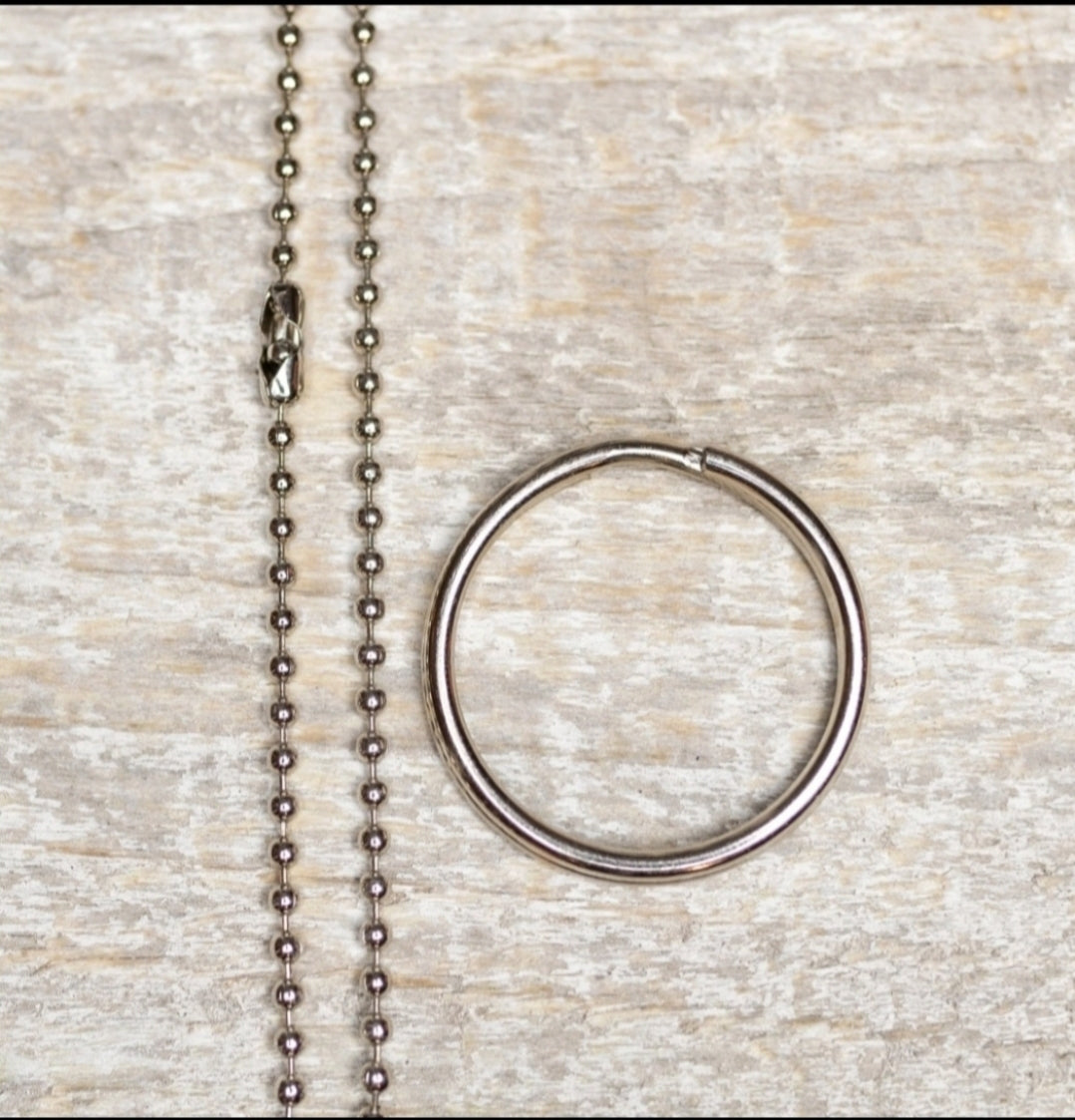 This product comes packaged with split key ring & 30" nickel plated steel ball chain, enclosed in a clear plastic sleeve.
