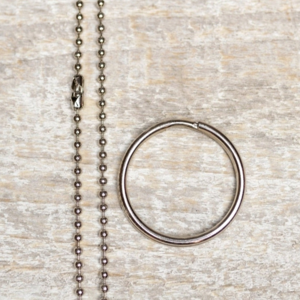 Perfect as a key ring, necklace or zipper pull, this 16 gauge brass disc is 1.5" in diameter and comes with both a 30” nickel plated steel ball chain and split key ring, enclosed in a clear plastic sleeve.
